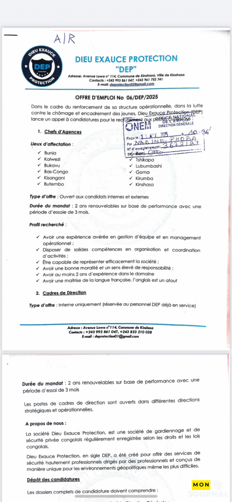 La société DIEU EXAUCE PROTECTION (DEP), entreprise congolaise spécialisée dans l’encadrement de la jeunesse dans les services de gardiennage et de sécurité privée, annonce ce 12 novembre 2025, le lancement officiel de son offre d’emploi n°06/DEP/2025. Cette initiative s’inscrit dans le cadre du renforcement de sa structure opérationnelle et de l’extension de ses activités sur l’ensemble du territoire national.