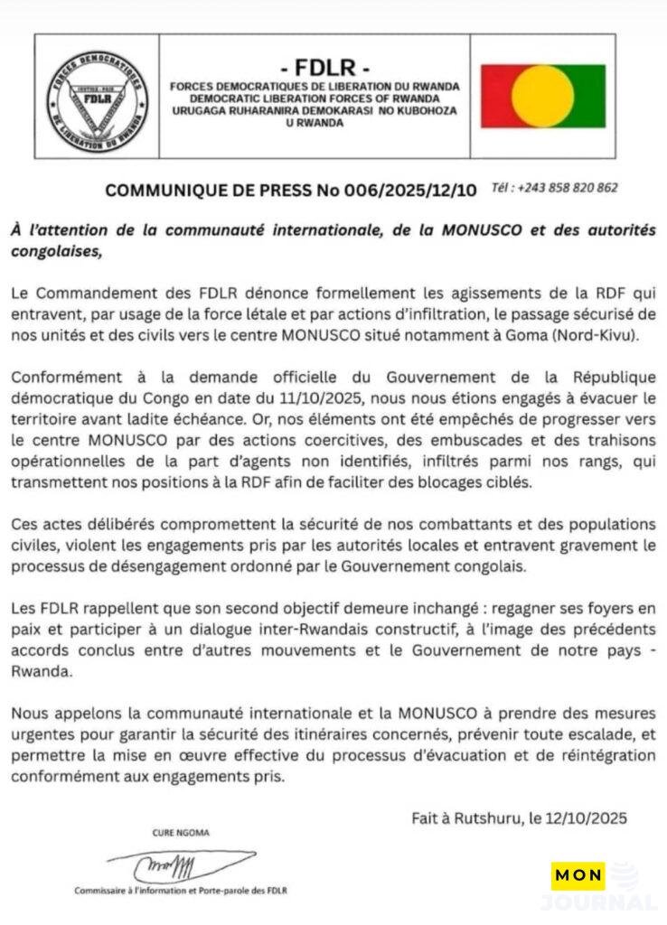Dans un communiqué publié le 12 octobre 2025, le commandement des FDLR dénonce des actions militaires et d’infiltration attribuées à la RDF, qui auraient empêché ses unités et plusieurs civils d’atteindre les centres de regroupement de la MONUSCO, notamment à Goma (Nord-Kivu).