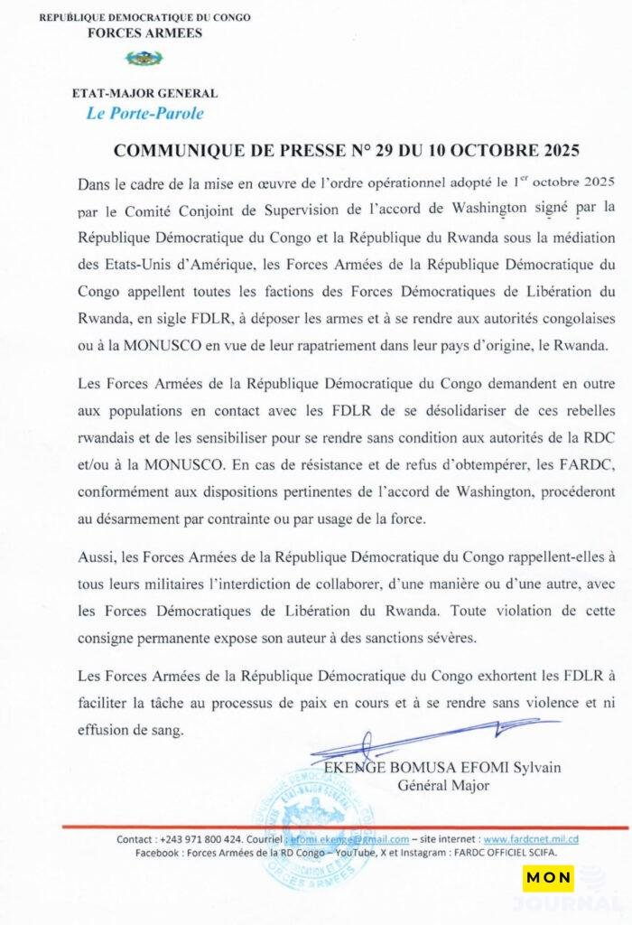 Dans le communiqué n°29 daté du 10 octobre 2025, les FARDC exhortent les combattants des FDLR à se rendre sans condition aux autorités congolaises ou à la MONUSCO pour un rapatriement au Rwanda.